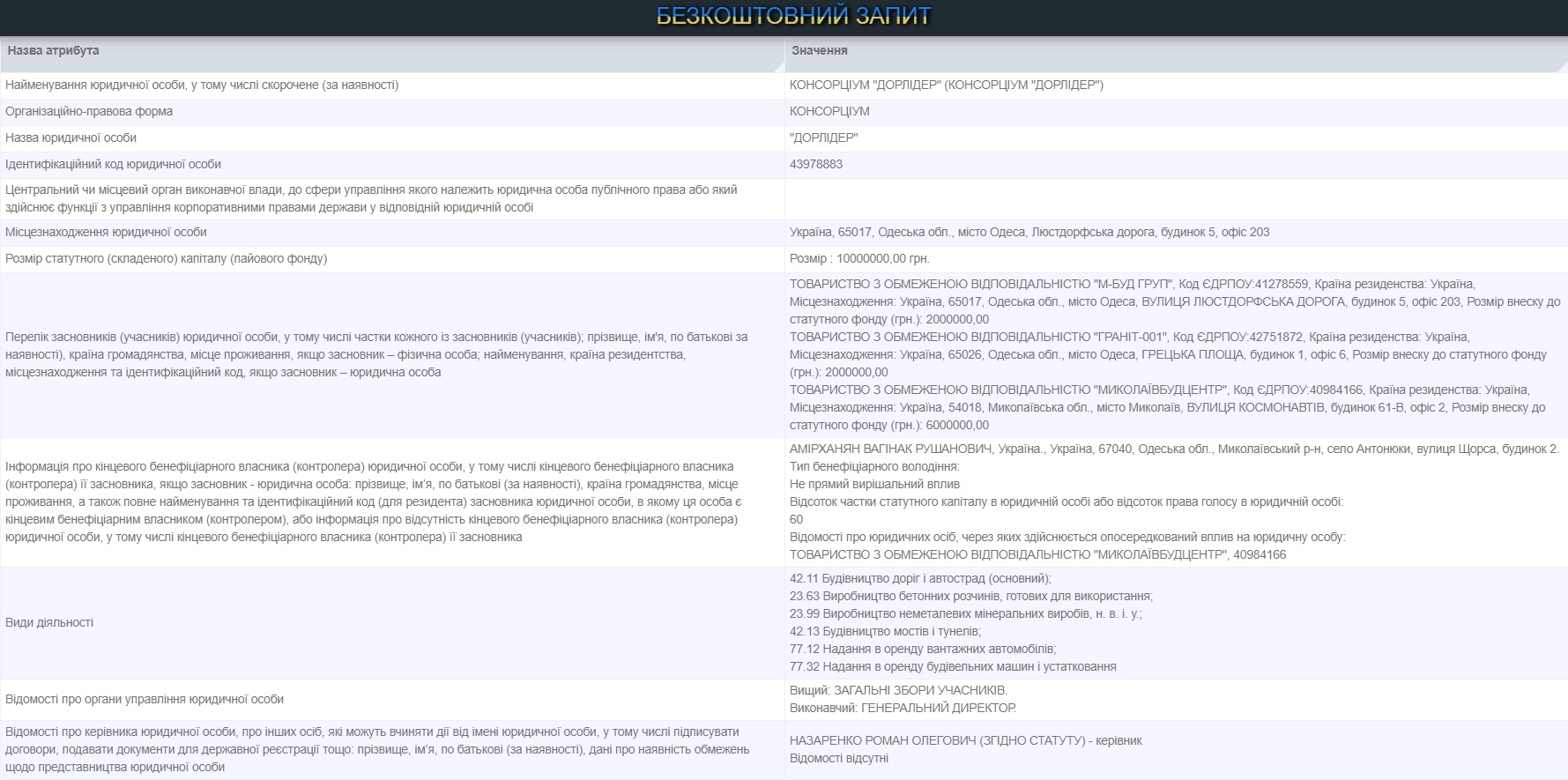 За даними Міністерства юстиції України Консорціум «Дорлідер» було зареєстровано у січні 2021 року трьома товариствами з обмеженою відповідальністю: «М-Буд Груп», «Граніт-001» та «Миколаївбудцентр», а кінцевим бенефіціаром є Вагінак Амірханян.