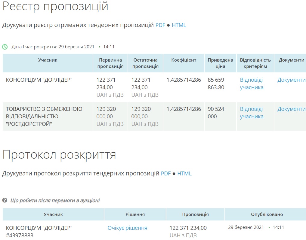 Згідно з даними системи, аукціон відбувся 29 березня і єдиними учасниками стали Консорціум «Дорлідер» та ТОВ «Ростдорстрой». В результаті переможцем визнали консорціум, який погодився робити за 85 мільйонів 659,9 тисяч гривень - на 4 мільйони 864,1 тисяч гривень дешевше, ніж ТОВ.