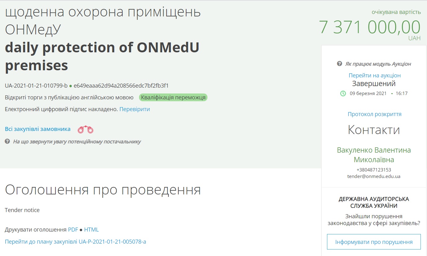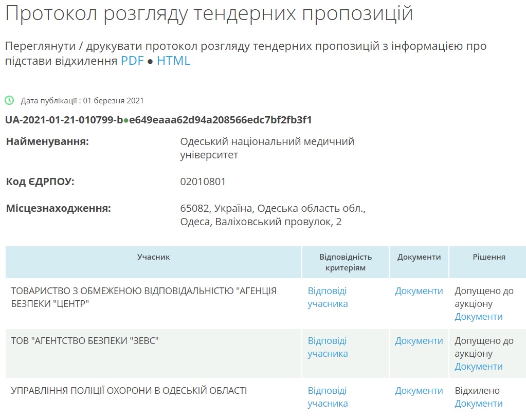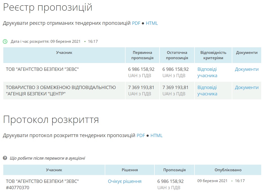 За даними системи, аукціон відбувся 9 березня і в ньому взяли участь дві компанії: Товариство з обмеженою відповідальністю «Агенція безпеки "Центр"» та товариство з обмеженою відповідальністю «Агентство безпеки "Зевс"». Був ще один охочий - Управління поліції охорони в Одеській області, проте його до аукціону не допустили.