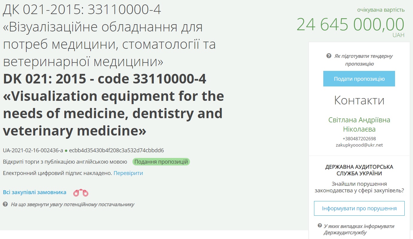 Комунальне некомерційне підприємство "Одеський обласний онкологічний диспансер" Одеської обласної ради" оголосило тендер для обрання поставника візуалізаційного обладнання для потреб медицини, стоматології та ветеринарної медицини.