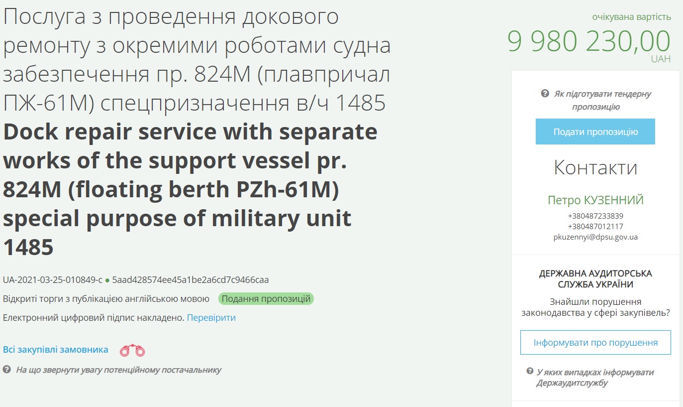 Аукціон з очікуваною вартістю закупівлі в 9 мільйонів 980,2 тисяч гривень має відбутися 31 травня. Компанія-переможець повинна буде очистити корпус, металеві частини, замінити ушкоджені фрагменти та пофарбувати відремонтований причал.