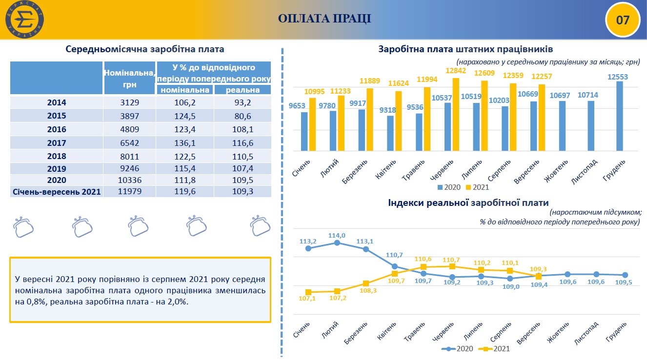 Середньомісячна номінальна заробітна плата штатних працівників підприємств, установ та організацій області (із кількістю працюючих 10 осіб і більше) за дев'ять місяців поточного року становила 11 тис. 979 грн, що на 19,6% більше порівняно з січнем–вереснем 2020 р.