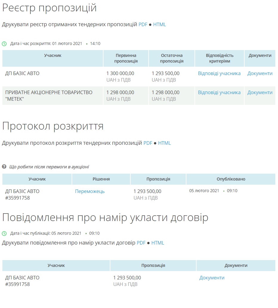 Про це повідомляється в системі електронних закупівель Prozorro.