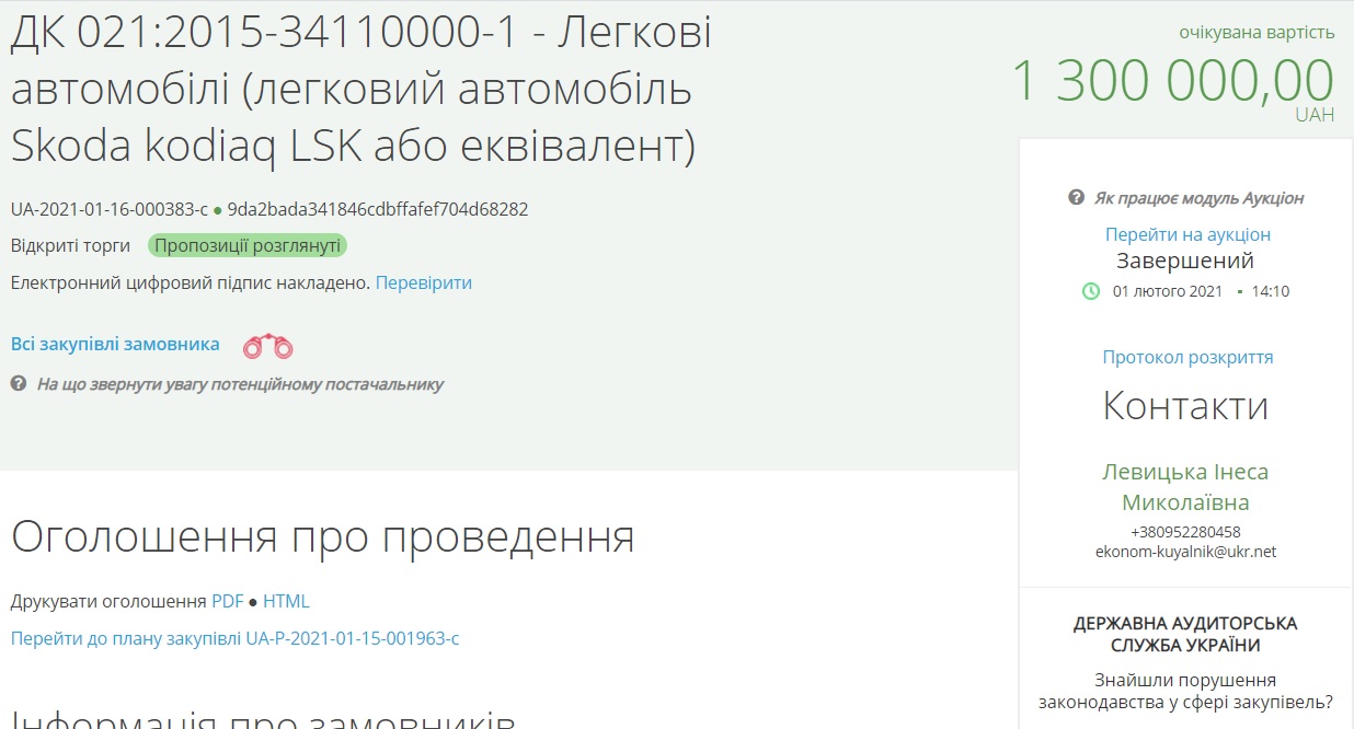 Куяльницька сільська рада Подільського району Одеської області уклала угоду про придбання автомобілю Skoda Kodiaq в компанії "Базіс авто" за 1 мільйон 293,5 тисячі гривень.