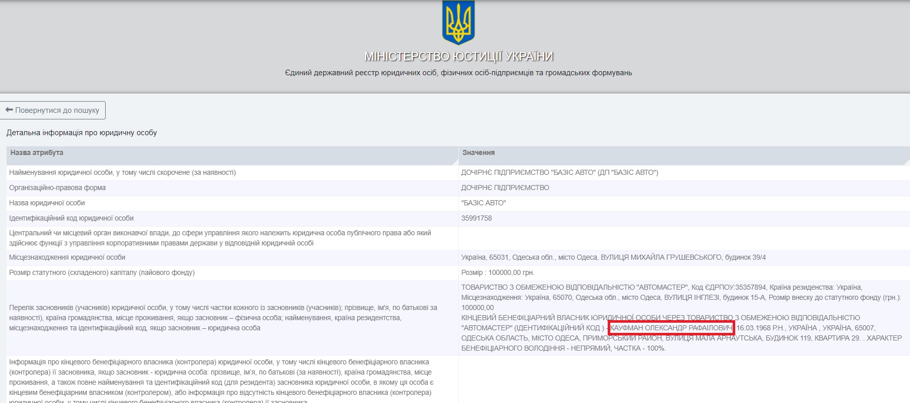 Компанія "Базіс авто" належить Олександру Кауфману. Можливо, брату відомого олігарха Бориса Кауфмана, принаймні в бізнесменів однакові по батькові - Рафаїлович.