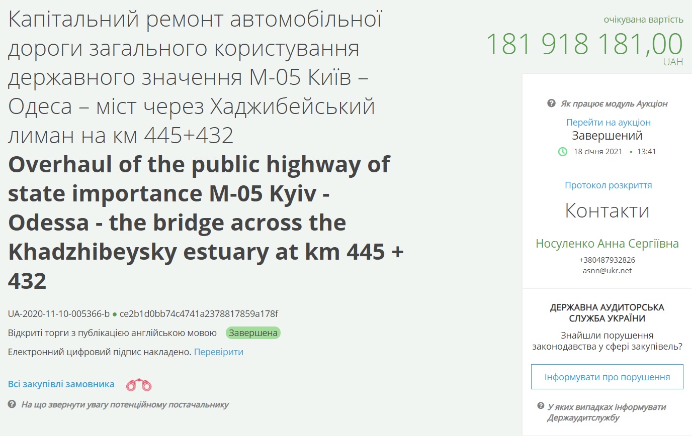 Щодо мосту через Хаджибейський лиман, то 8 лютого 2021 року Служба автомобільних доріг в Одеській області уклала угоду із ТОВ «Підприємство "Маст-Буд"». Компанія має отримати за цією угодою 181 мільйон 860,6 тисяч гривень. Аукціон відбувся 18 січня 2021 року і окрім переможця в ньому брало участь ТОВ «Мостобудівельний загін № 112». Був ще один охочий Товариство з обмеженою відповідальністю «Будівельна компанія "Метком інвест"», проте його не допустили до участі.