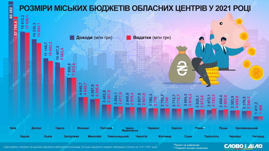 Втім, найбільший бюджет на 2021 у Києва: доходи – 60,4 млрд грн, витрати – 57,79 млрд. Основна частина витрат припадає на освіту (24,7 млрд грн), транспорт і дорожнє господарство (8,7 млрд грн), охорону здоров'я (майже 6,2 млрд), соціальний захист (5,1 млрд), житлово-комунальне господарство (майже 3,8 млрд).