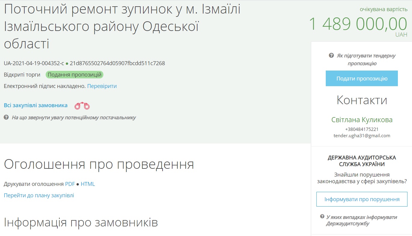 Управління житлово-комунального господарства Ізмаїльської міської ради Ізмаїльського району Одеської області оголосила тендер для обрання підрядника, якому заплатять за поточний ремонт зупинок у місті.