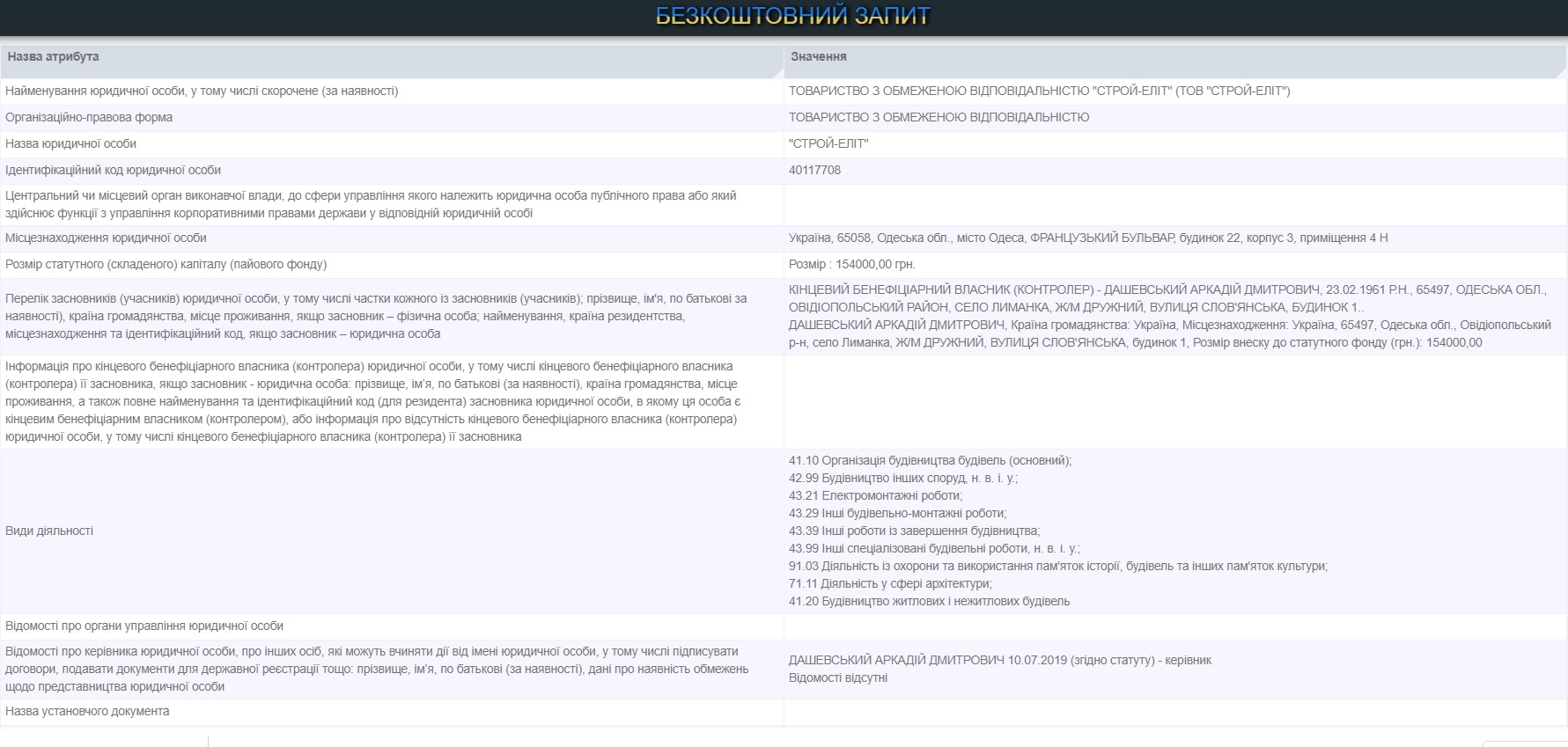 За даними реєстру юридичних осіб компанія "Строй-Еліт" заснована у 2015 році Аркадієм Дашевським. Він й керує компанією.