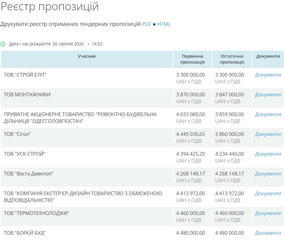 Тоді ТОВ «Строй-Еліт» стало переможцем, але конкурс скасували, тому що все пропозиції учасників відхилили.