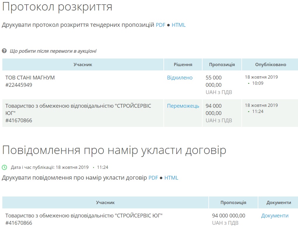 Компанія «Стройсервіс ЮГ» зголосилася працювати за 94 мільйони і, незважаючи, що його конкурент пропонував 55 мільйонів, була оголошена переможцем.