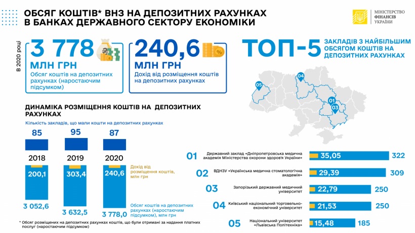 У 2020 році 87 закладів отримали дохід від розміщення коштів на депозитних рахунках у розмірі 240,6 млн грн.