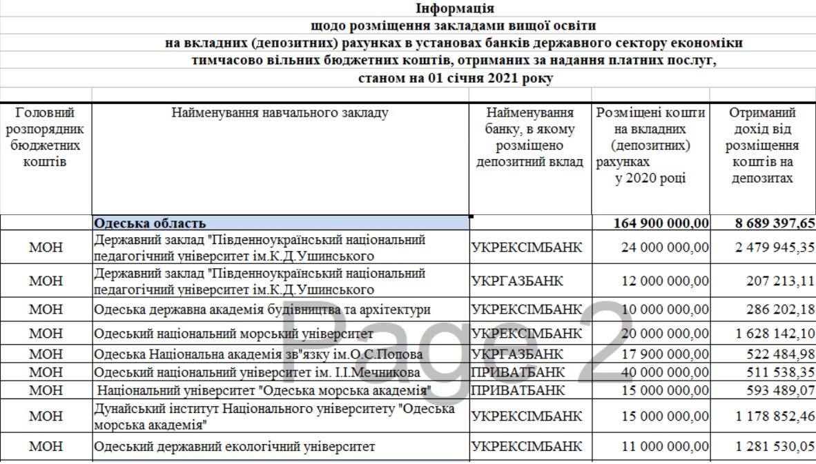 Втім, за даними Кабінету міністрів, виші Одеської області не потрапили до ТОП-5 закладів із найбільшими вкладами на банківських рахунках.