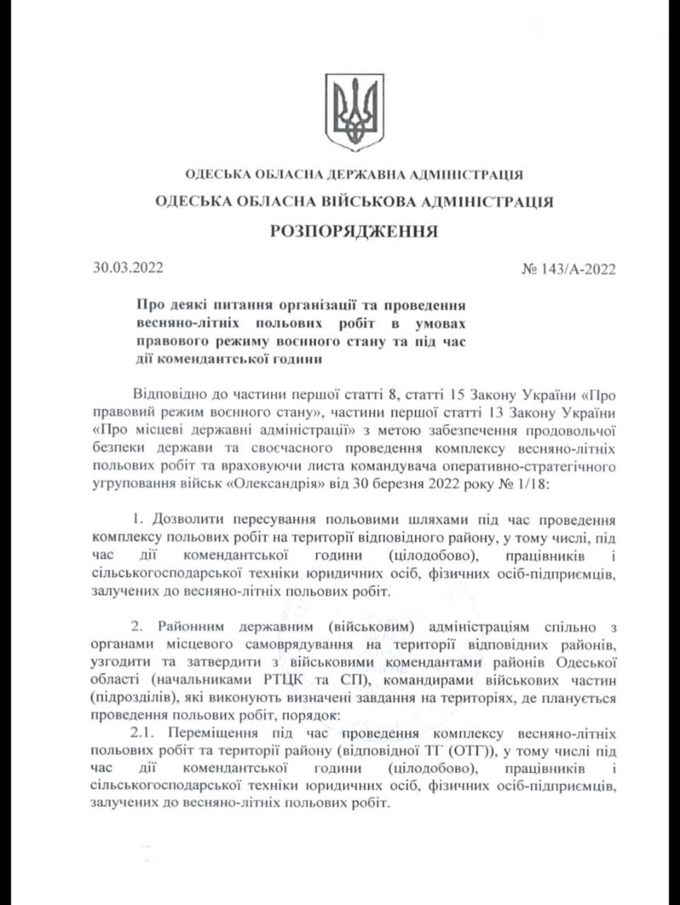 Районним військовим адміністраціям спільно з органами місцевого самоврядування треба узгодити та затвердити із військовими комендантами списки аграріїв та сільськогосподарської техніки, залучених до весняно-польових робіт.