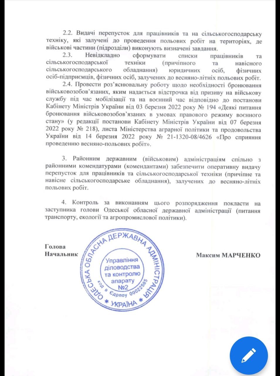 Відповідне розпорядження підписав очільник Одеської ОВА Максим Марченко, повідомили в Департаменті аграрної політики, продовольства та земельних відносин Одеської обласної державної адміністрації.