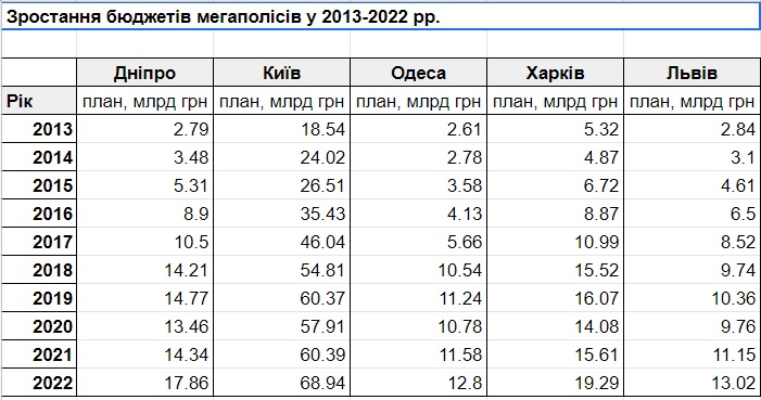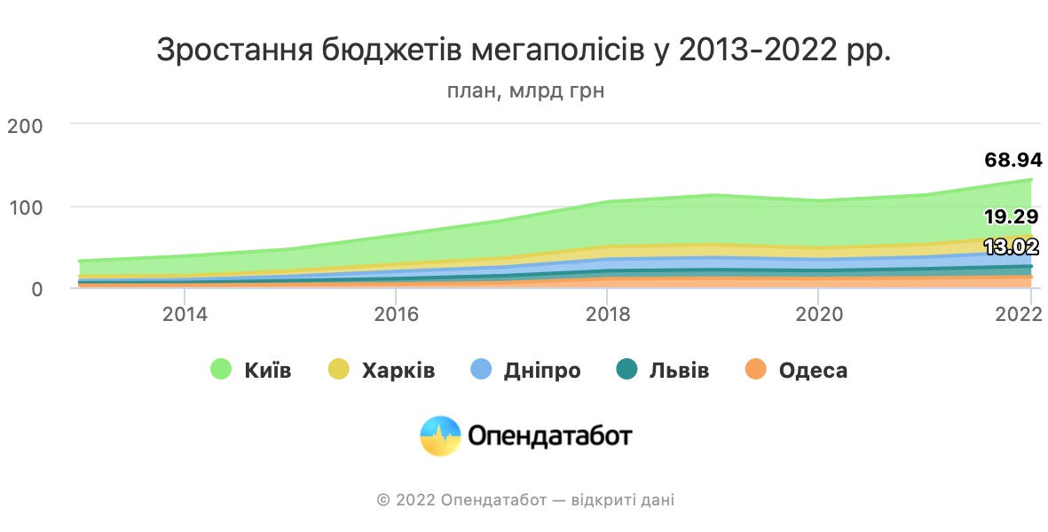 За підрахунками аналітиків платформи, також зростали бюджети інших великих міст. Наприклад, 69 млрд грн склав бюджет Києва у 2022 році, 18 млрд — бюджет Дніпра, 19 млрд — бюджет Харкова, 13 млрд — фінанси Львова. Урізання міських бюджетів відбулося за 7 років лише одного разу — у ковiдному 2020-му.