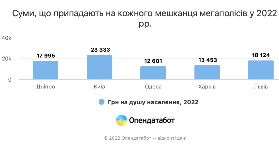 За кількістю бюджетних грошей на душу населення наразі, як завжди, лідирує Київ — 23,3 тис. грн. Друге та третє місце — у Львова та Дніпра: по 18 тис. грн на людину у 2022 роцi.