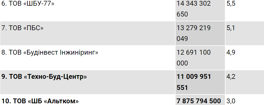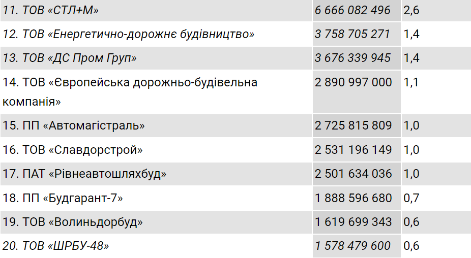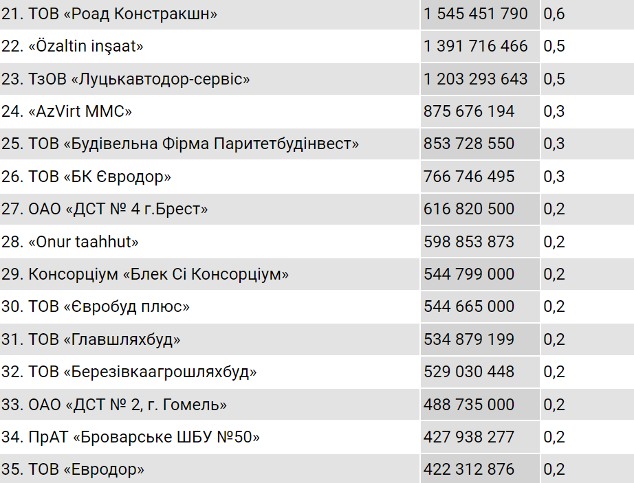Далі вже з більш помітним відривом йде компанія «Онур конструкціон інтернешнл», яка у 2021 році отримала від «Укравтодору» 26,1 млрд грн, тобто 10%.