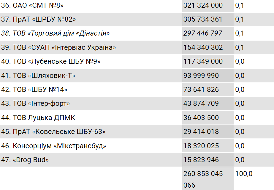 На четвертому місці серед топпідрядників опинилась компанія «Ростдорстрой», яка отримала 25,1 млрд грн (9,6%). Замикає п’ятірку найбільших підрядників у 2021 році «Хмельницьке ШБУ №56» – «Укравтодор» їй виділив 17,3 млрд грн (6,6%).