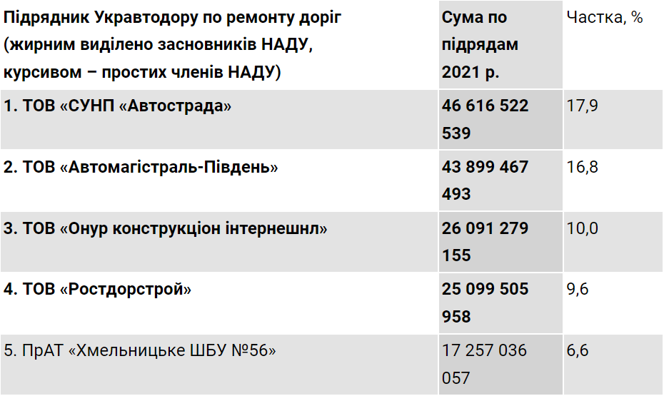 Найбільшу частку від усіх коштів у 2021 році отримала компанія «Автострада» – 17,9% (46,6 млрд грн). Дещо менше, 16,8%, дісталось компанії «Автомагістраль-Південь» – 43,9 млрд грн.