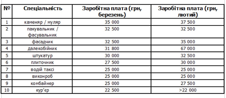 У березні працедавці змістили фокус уваги з працівників сфери торгівлі. Кількість вакансій продавців знизилась з 10 тис. до 6,3 тис. Поменшало вакансій і кухарів, а пропозиції для офіціантів взагалі зникли з найпопулярніших. При цьому зберігається відносно стабільний попит на вантажників, охоронців, кур’єрів, нянь та швачок.