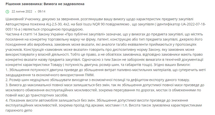 У ДСНС натомість відповіли, що закон про публічні закупівлі не зобов'язує замовника торгів встановлювати варіативність вимог, а викладені у конкретній тендерній документації вимоги обумовлені специфікою економічної ситуації та роботи. Наприклад, більш потужний двигун, як пропонували у ТОВ, буде споживати більше пального, яке дорожчає, тобто це не відповідає критерію економії, більша маса позначиться на дорожному покритті. Розмір шин обумовлений дефіцитом цього товару, а висота нижче трьох метрів обрана з урахуванням можливостей проїзду під арками.