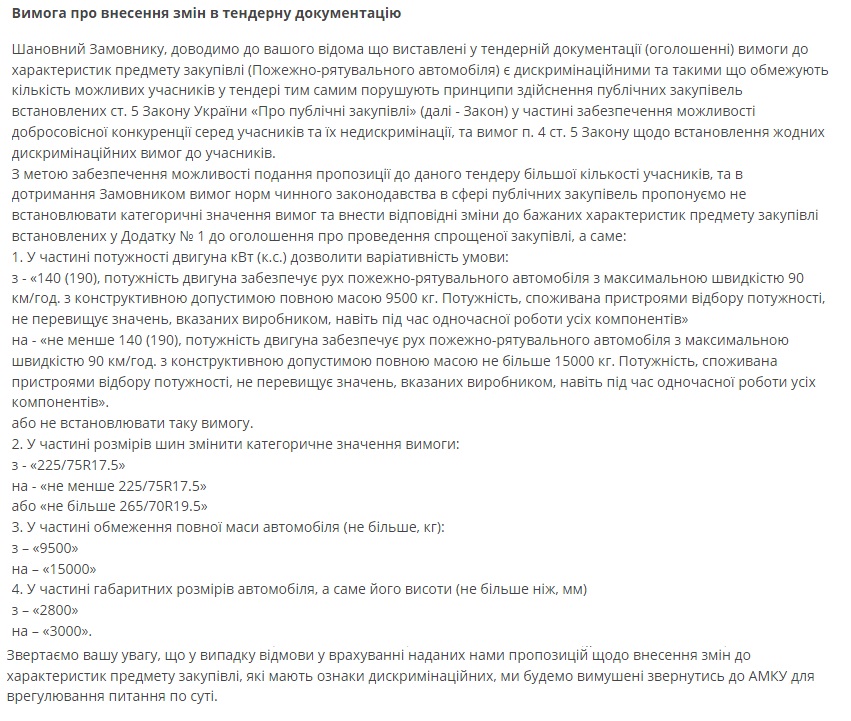 Зокрема ТОВ вважало дискримінаційними умовами вимоги щодо потужності двигуна 140 кВт, тобто 190 кінських сил, допустимої повної маси 9,5 тонн, розміру шин та максимальної висоти цистерни. Компанія вважала, що рятувальники дискримінують учасників торгів, встановлюючи жорсткі критерії без варіативності. У разі незадоволення скарги "Київський Республіканський Автоцентр" погрожував звернутися до Антимонопольного комітету.