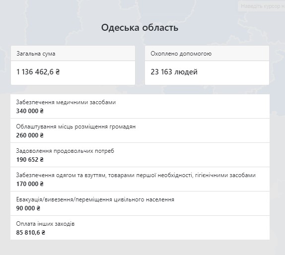 Зокрема, щодо Одеської області, де допомогу отримали 23 тисячі 163 переселенці, з рахунку міністерства витрачені 1 мільйон 136,5 тисяч гривень, з яких 340 тисяч витрачені на забезпечення медичними засобами, 260 тисяч на облаштування місць розміщення громадян, 190,7 тисяч на задоволення продовольчих потреб та 170 тисяч на забезпечення одягом та взуттям, а також товарами першої необхідності і гігієнічними засобами.