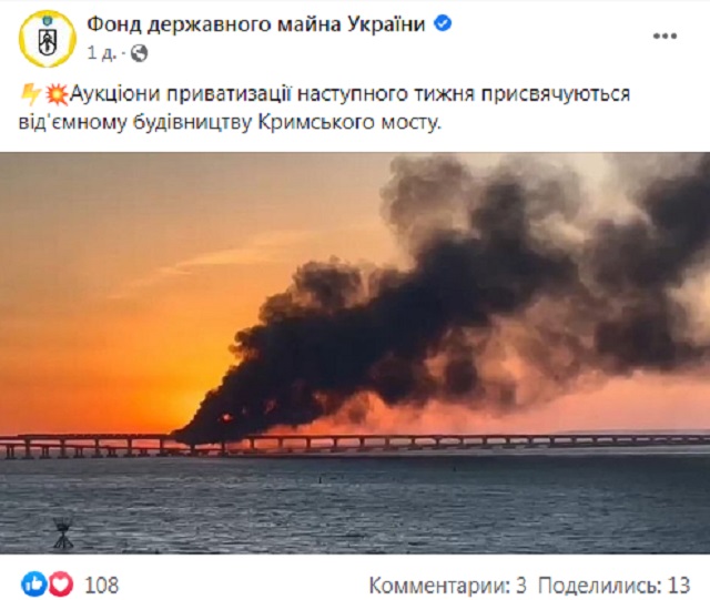 Фонд державного майна України заявив, що усі аукціони приватизації наступного тижня тобто з 10 по 15 жовтня присвячуються руйнації Керченського мосту.
