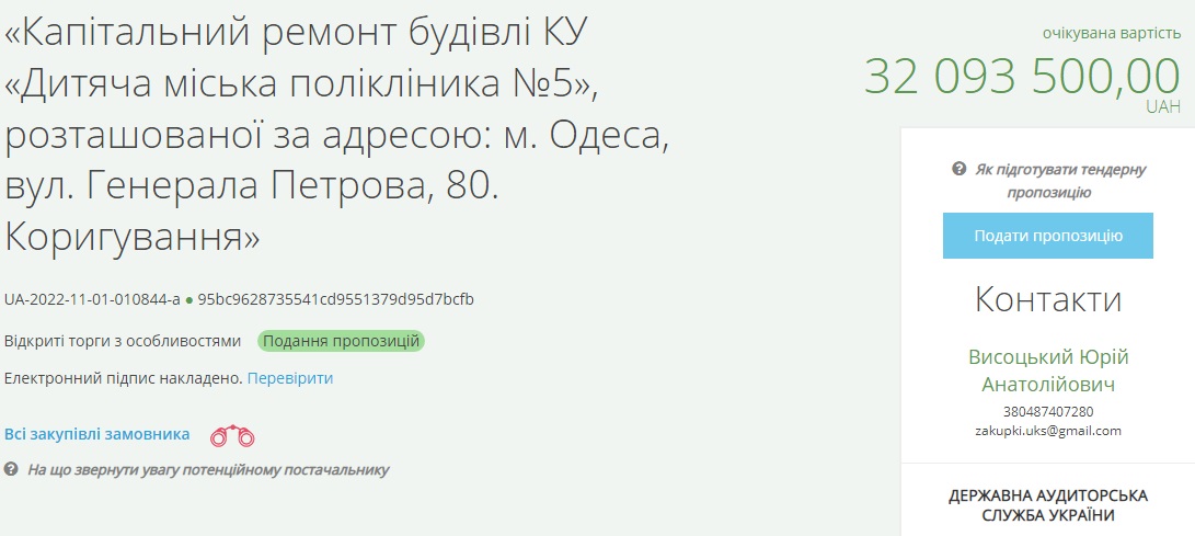 Управління капітального будівництва Одеської міської ради оголосило тендер для обрання підрядника, якому заплатять за капітальний ремонт будівлі комунальної установи "Дитяча мiська полiклiніка №5".