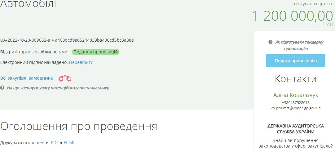 Спеціалізована прокуратура у військовій та оборонній сфері Південного регіону оголосила тендер для обрання постачальника легкових автомобілів.