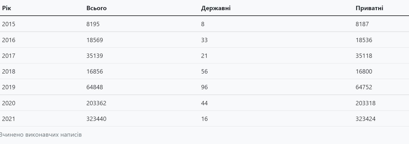 До початку війни стягнення заборгованості та внесення боржників до ЄРБ без суду за виконавчими написами було практикою, яка дедалі більш набувала поширення. Так, лише за 2021 рік нотаріуси винесли 323 440 написів — це у 6 разів більше, аніж у 2019 році. На сьогодні в Єдиному державному реєстрі боржників значиться 652 652 виконавчих проваджень, відкритих на підставі не судових рішень, а так званого виконавчого нотаріального напису.
