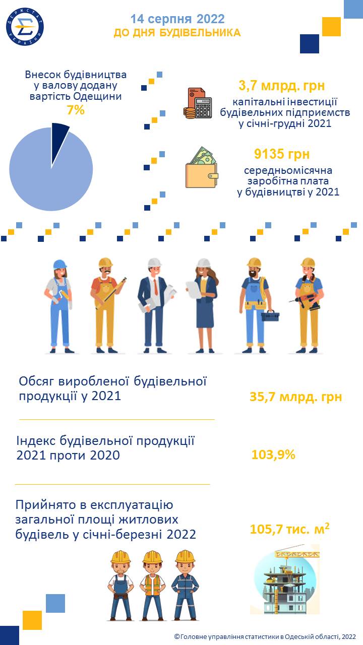 У минулому році обсяг виробленої будівельної продукції підприємствами області становив 35,7 млрд. грн. Частка Одещини в загальнодержавному обсязі виробленої будівельної продукції становила 14%, і за цим показником область посіла друге місце серед регіонів України.