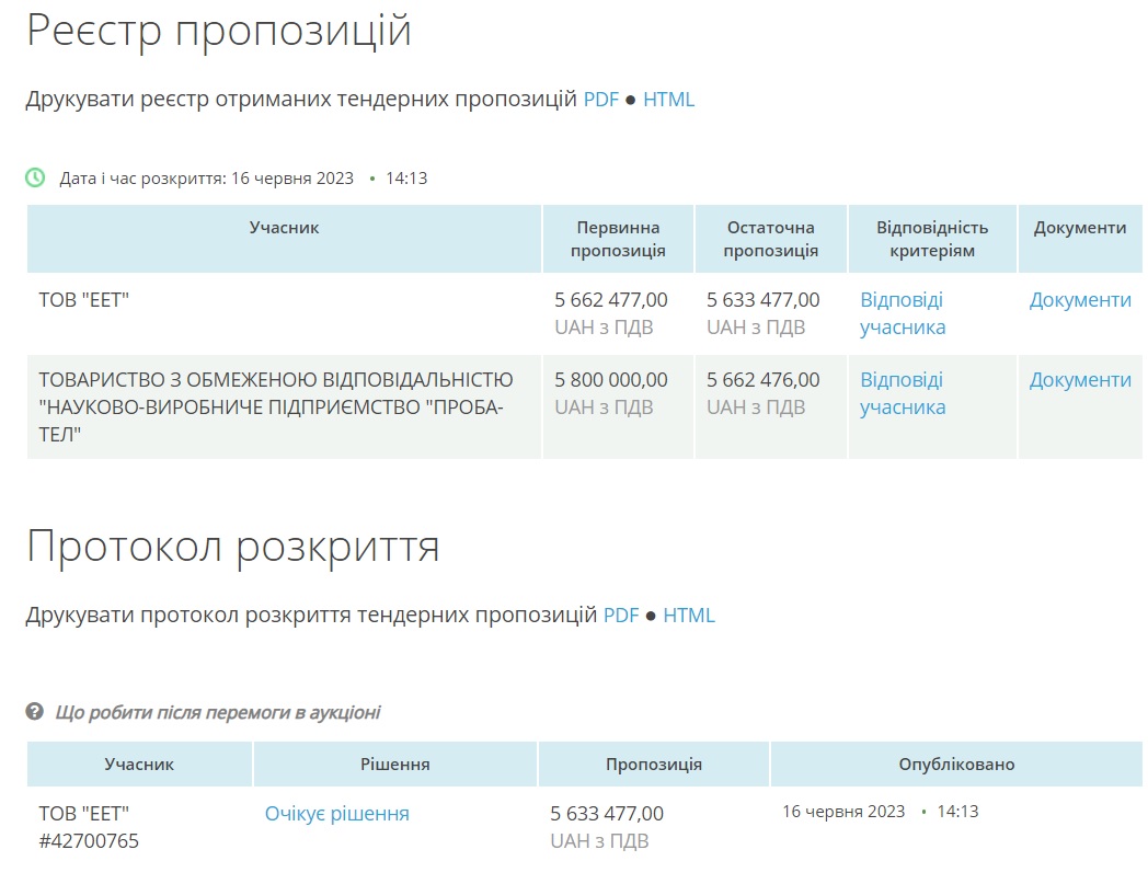 Переможцем обрали ТОВ "ЕЕТ", яке зголосилося продати департаменту обладнання за 5 мільйонів 633 тисячі 477 гривень.
