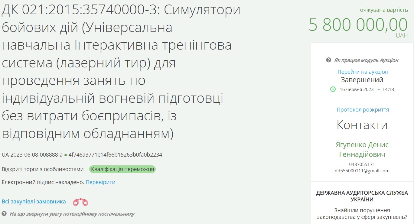 За даними системи, йдеться про універсальну навчальну інтерактивну тренінгову систему (лазерний тир) для проведення занять по індивідуальній вогневій підготовці без витрати боєприпасів, із відповідним обладнанням.