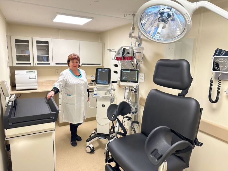 Модульний пункт, призначений для приймання пологів, обладнано необхідними меблями, кондиціонером, сонячною панеллю, а також портативним УЗД-апаратом та іншим медичним обладнанням.