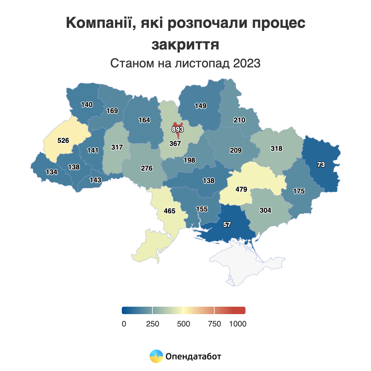 Лідером за кількістю компаній що зачиняються чи вже припинили діяльність в Україні є Київ. У столиці аналітики Опендатаботу нарахували 893 таких компанії. На другому місці — Львівщина - 526, Дніпропетровщина на третьому - 479 й остання в п'ятірці лідерів — Київщина де зачинятись вирішили 367 компаній.