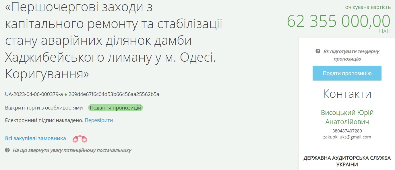 Аукціон з очікуваною вартістю закупівлі у 62 мільйонів 355 тисяч гривень запланований на 17 квітня, у форматі відкриті торги з особливостями.
