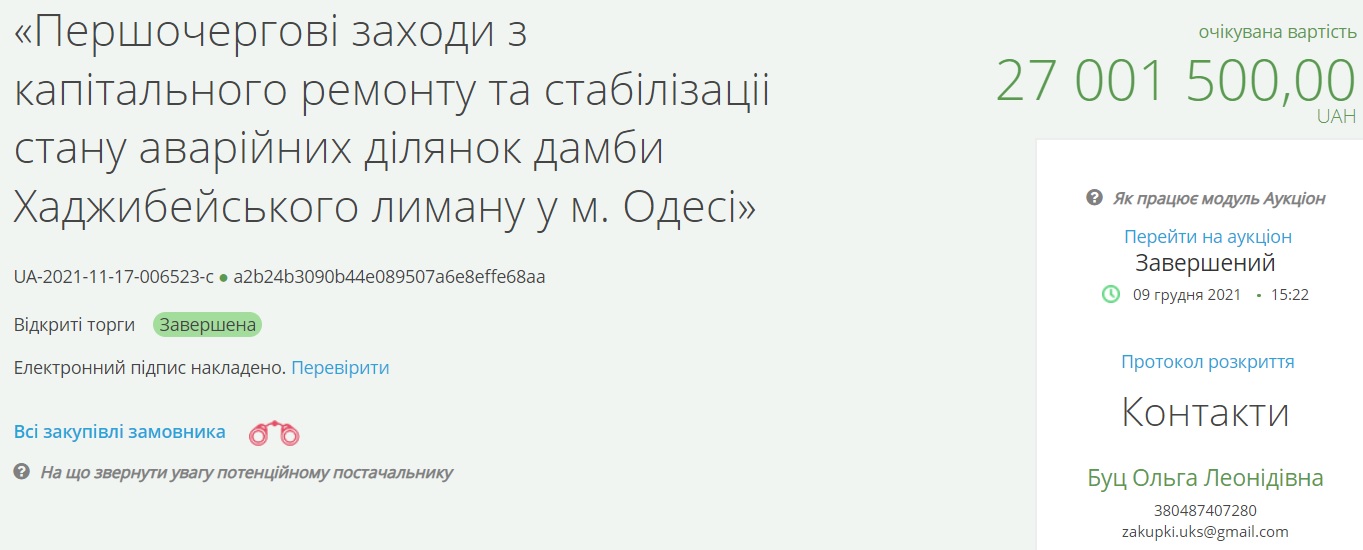 Тоді Одеський міський голова Геннадій Труханов під час апаратної наради в муніципалітеті 20 грудня повідомив, що першочерговi заходи з капiтального ремонту та стабiлiзацiї стану аварiйних дiлянок дамби Хаджибейського лиману оплачуватимуться з державного бюджету. Утім, у листопаді 2022 року угоду розірвали за домовленістю сторін.