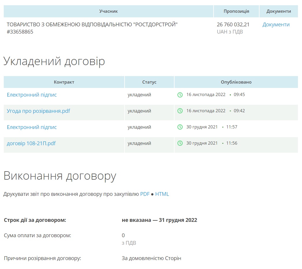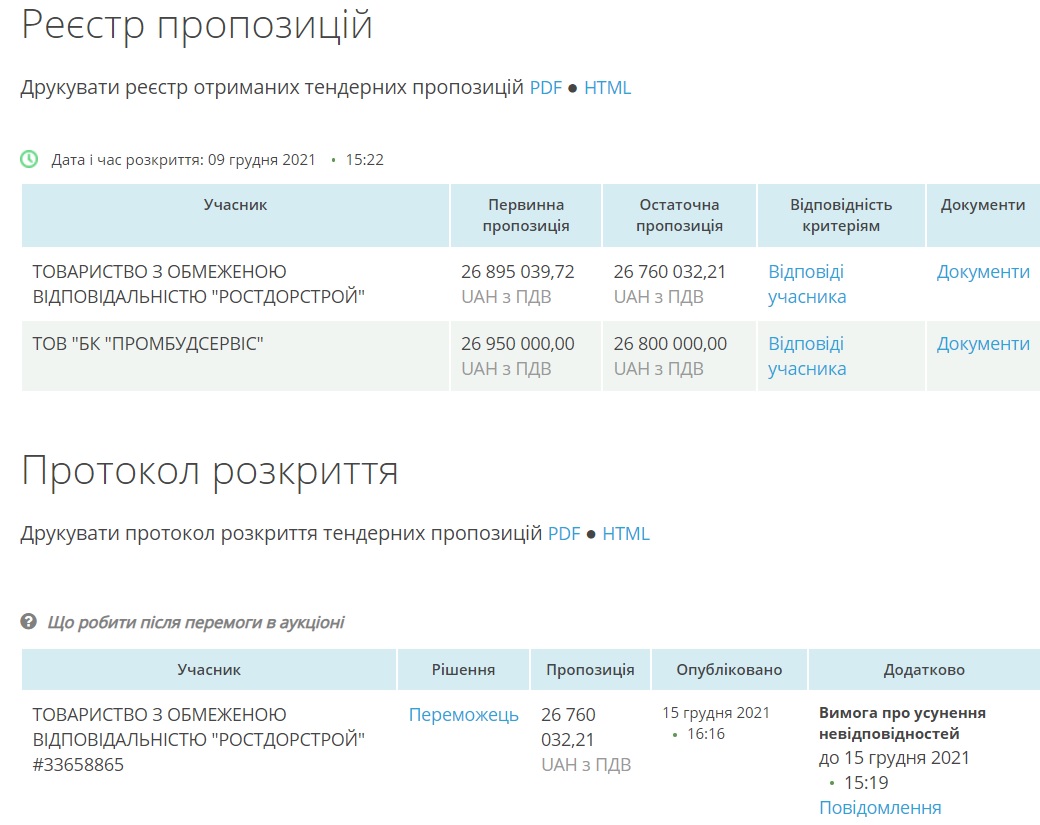 Переможцем визнали останнє, яке згодилось працювати за 26 мільйонів 760 тисяч гривень. Компанія повинна завершити роботу до 31 грудня 2022 року.