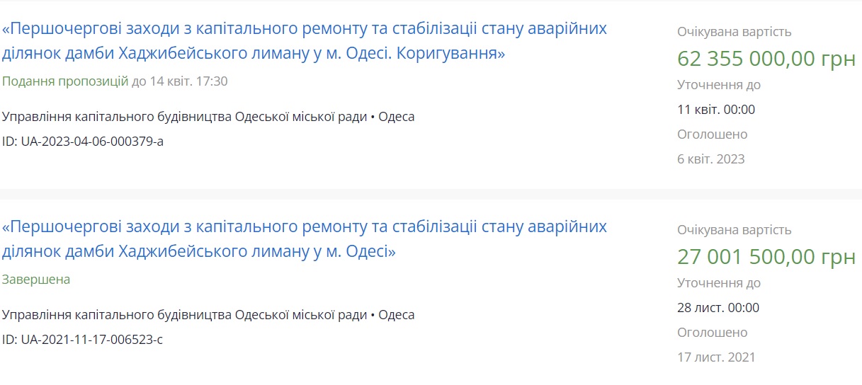 Управління капітального будівництва Одеської міської ради оголосило тендер для обрання компанії, якій заплатять за першочерговi заходи з капiтального ремонту та стабiлiзацii стану аварiйних дiлянок дамби Хаджибейського лиману в Одесi.