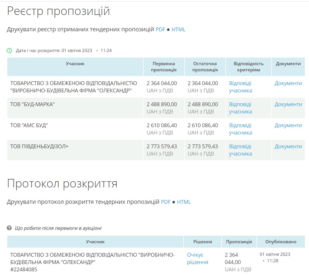 Переможцем обрали ТОВ "Виробничо-будівельна фірма "Олександр", яке погодилося працювати за 2 мільйони 364 тисячі гривень.