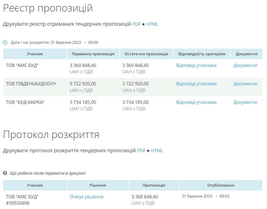 Цього разу обрали переможцем ТОВ "АМС Буд", яке погодилося працювати за 3 мільйони 360,8 тисячі гривень.
