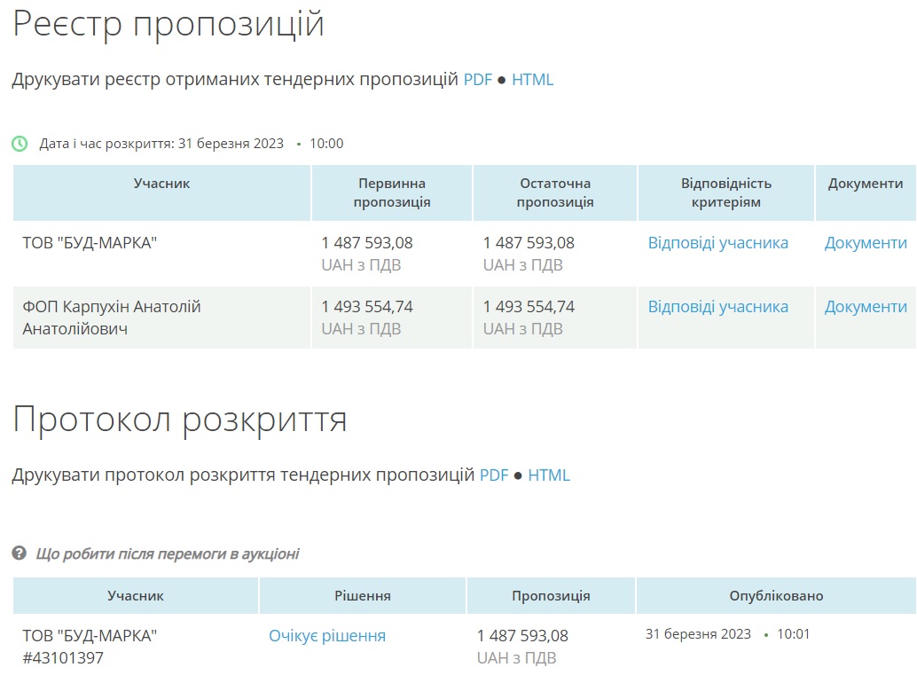 Відповідна інформація міститься в системі електронних закупівель Prozorro.