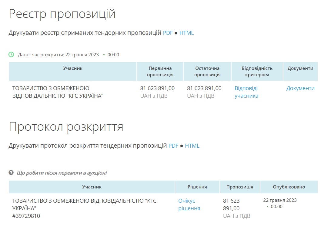 За даними системи, закупівля відбулася у форматі відкритих торгів з особливостями, тож підрядника, як й передбачав Інтент, обрали без проведення аукціону.