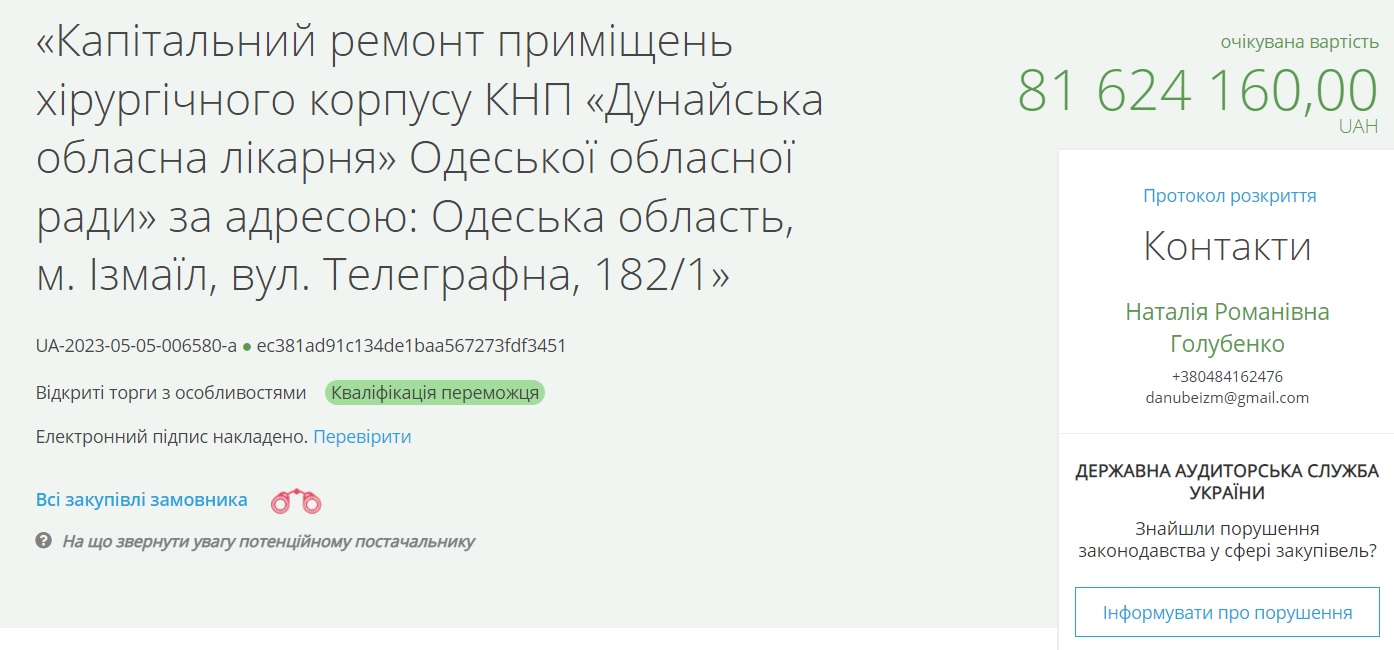 Цей самий підрядник до 20 грудня 2022 року зробив за 1 мільйон 210 тисяч гривень капітальний ремонт приміщення лікувального корпусу Дунайської обласної лікарні для облаштування у ньому рентгендіагностичного кабінету.