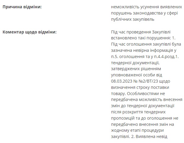 Однак, зрештою, аукціон скасували через неможливість усунення виявлених порушень законодавства у сфері публічних закупівель.