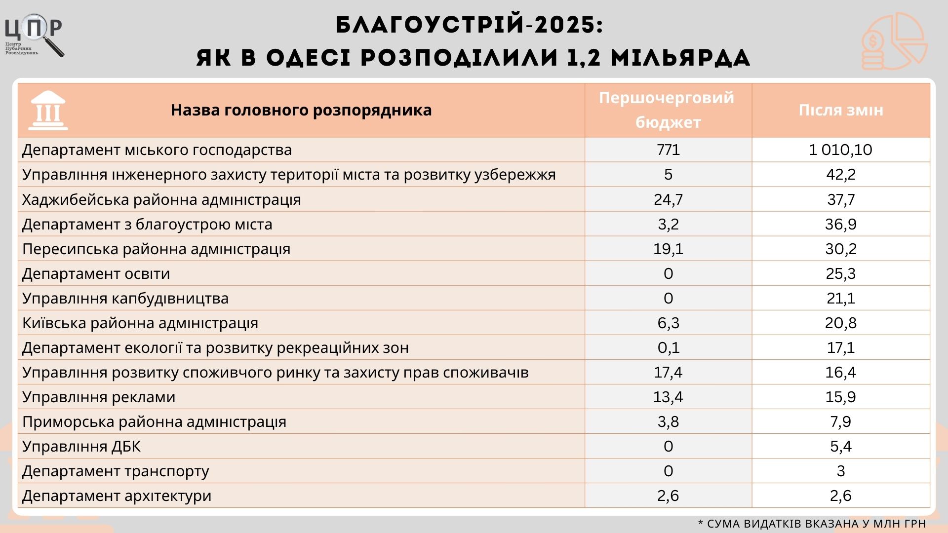 Зокрема, департамент з благоустрою міста передбачив 25 мільйона гривень на визначення технічного стану житлових і нежитлових будівель у межах програми "Незламна Одеса", а також майже 2 мільйони гривень на інвентаризацію дитячих і спортивних майданчиків. Окремо 10 мільйона гривень заклали на ліквідацію наслідків руйнувань на об’єктах благоустрою, однак пооб’єктний перелік витрат у документах відсутній.