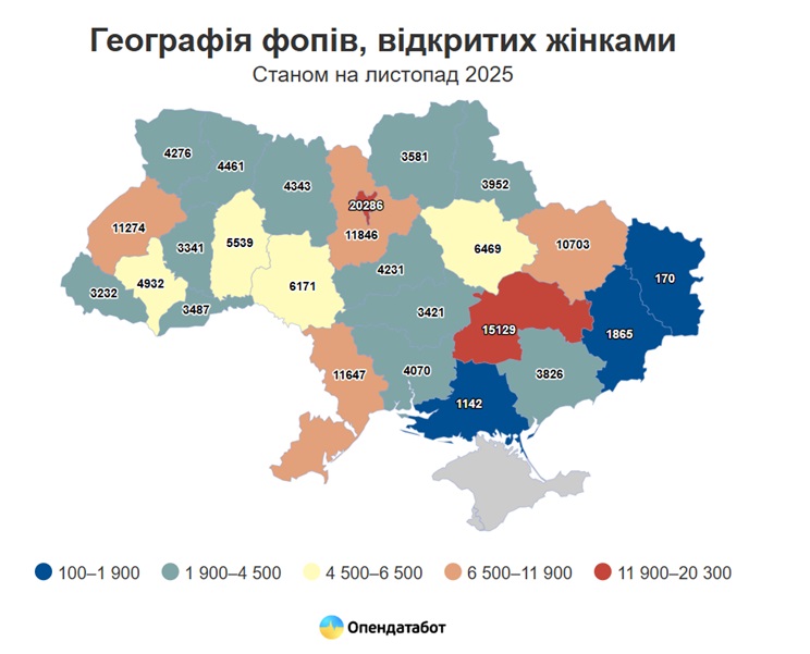 Впродовж 2025 року в Одеській області жінки реєструвалися як фізичні особи-підприємці 11 тисяч 647 разів за цим показником Одещина четверта в Україні.