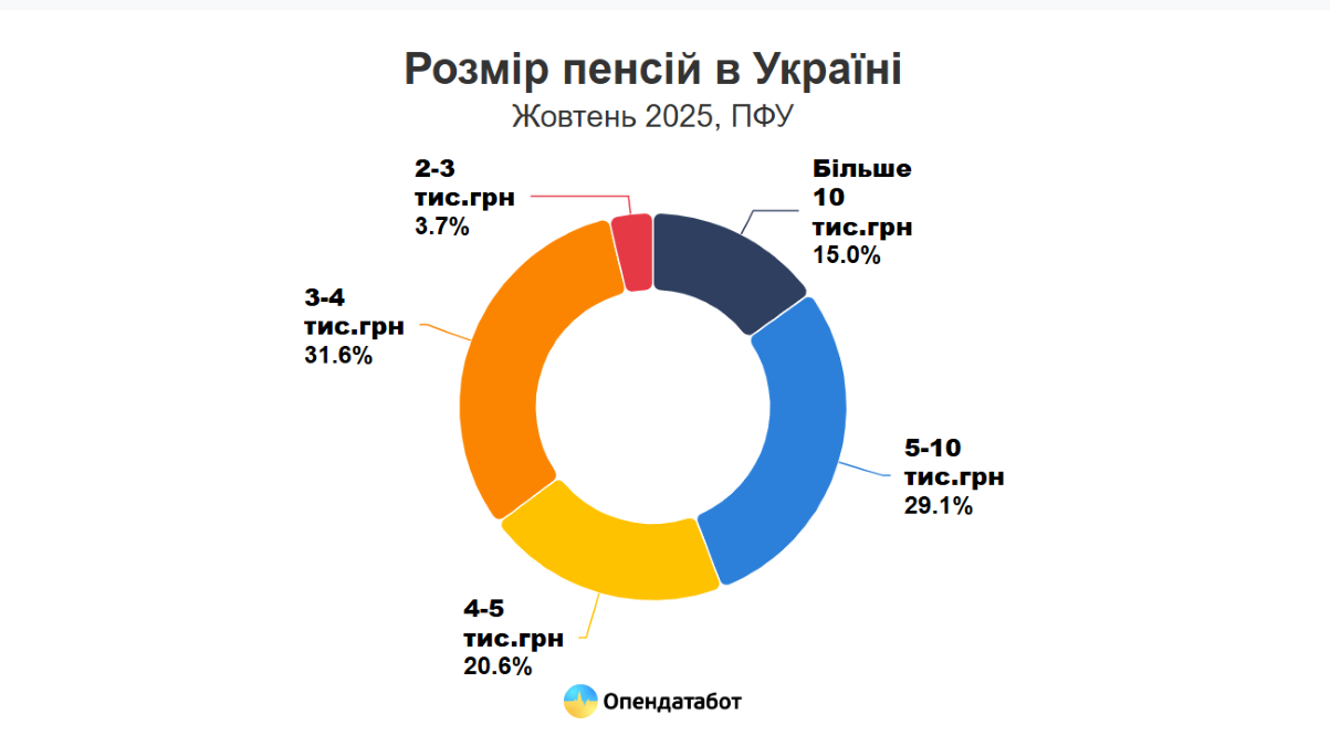 Для порівняння, торік 26% пенсіонерів мали виплати менше ніж 3 000 гривень, але завдяки перерахунку ця частка зменшилась. За структурою виплат, найбільша група українських пенсіонерів отримує від 3 до 4 тисяч гривень (31,6%), ще 20,6% — від 4 до 5 тисяч, а майже третина — від 5 до 10 тисяч гривень.